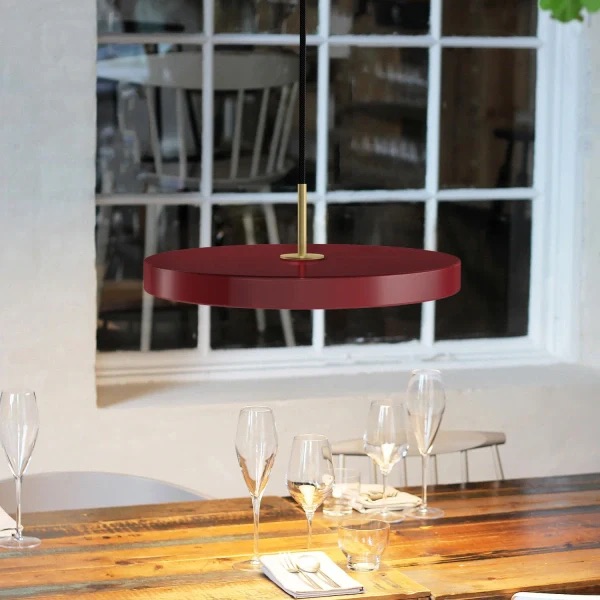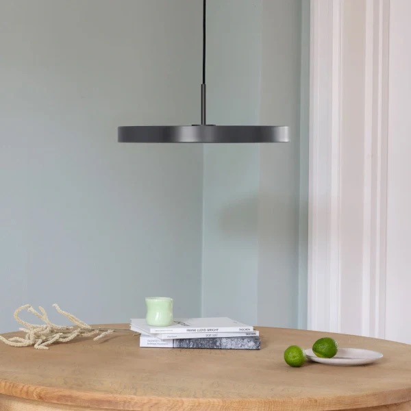 »Asteria« besteht aus Stahl, Aluminium und Acryl. Die Pendelleuchte ist dimmbar über einen externen Dimmer.